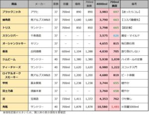 ここでのコスパとは、ボトル換算した時の価格を表している。